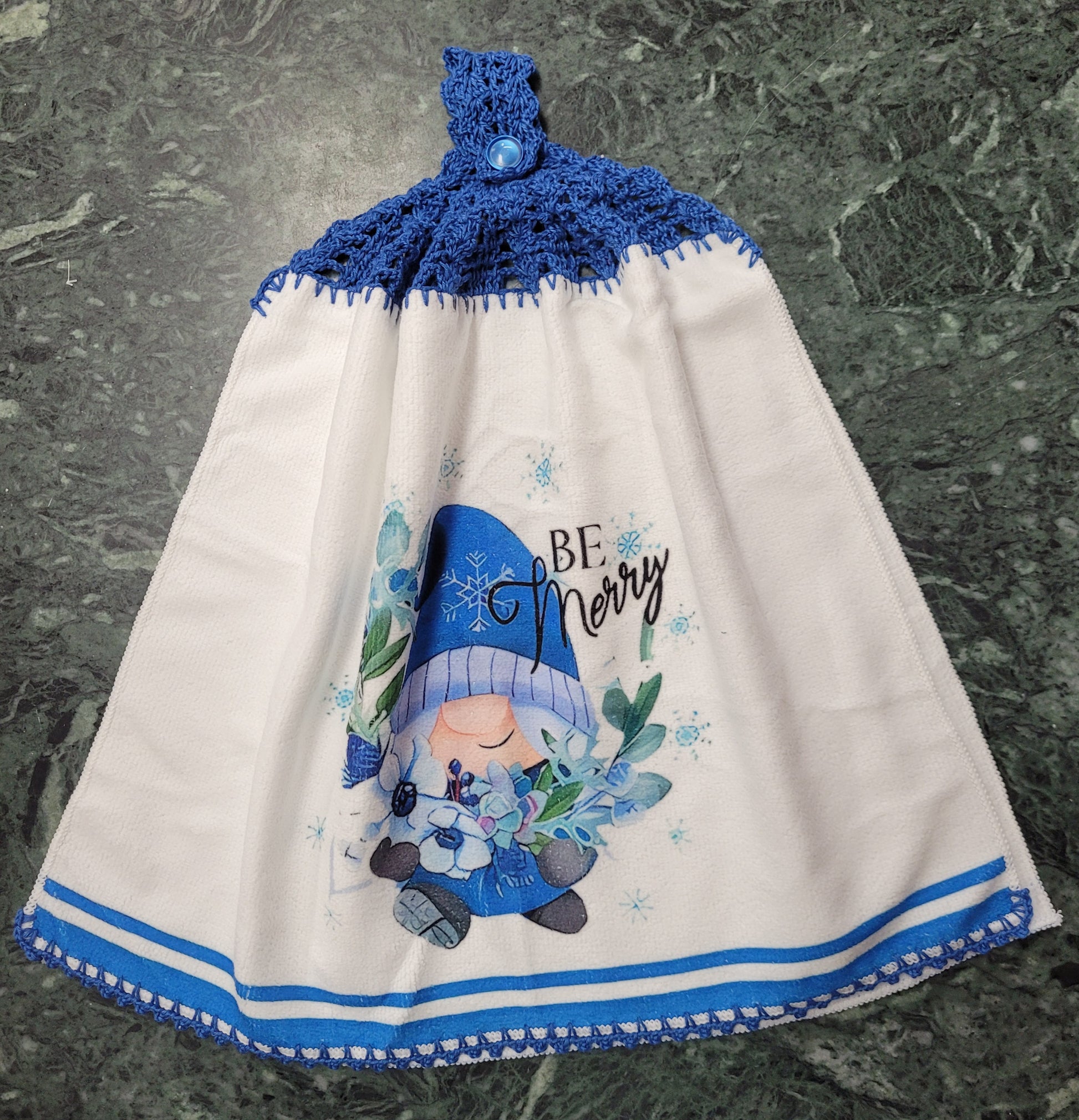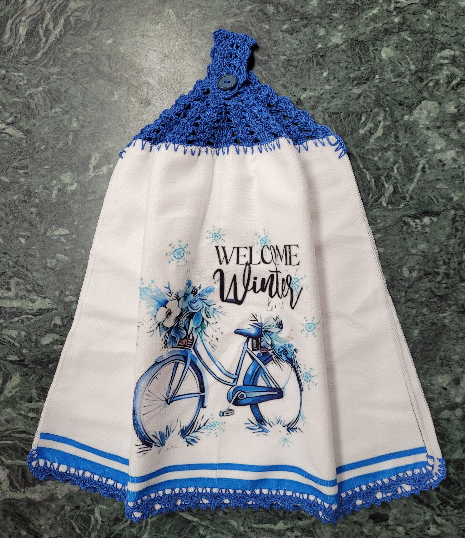 100% cotton hand towel with crocheted top and button strap.